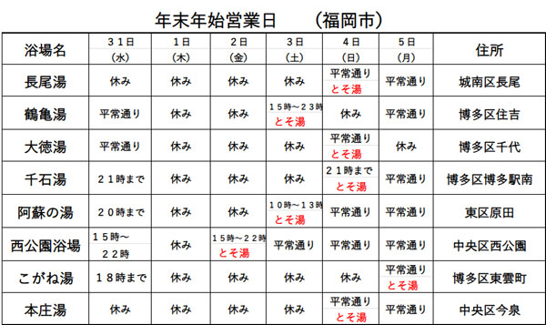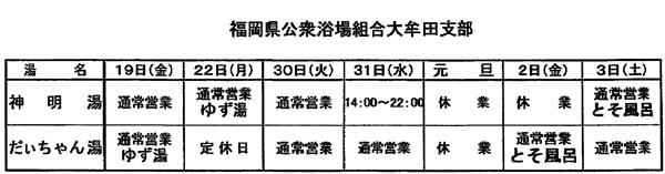 大牟田地区銭湯の年末年始営業日のお知らせ