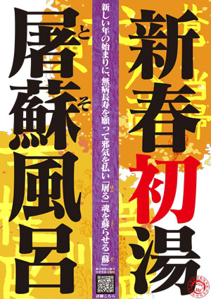 年の初めの縁起物として「とそ風呂」を実施致します。今年一年の無病息災を願い、ご家族そろって入浴にいらっしゃいませんか。